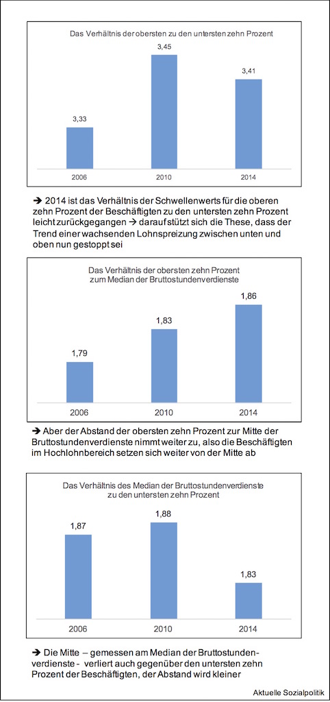 Schaut man sich die Entwicklung der Relationen von ganz oben zu ganz unten sowie der Mitte zu den beiden Enden der Verteilung an, dann wird erkennbar, dass die These vom Ende der zunehmenden Lohnspreizung zwar formal für die Relation zwischen ganz oben und unten zutrifft, aber immer noch auf einem höheren Niveau angesiedelt ist als im Jahr 2006. Aus der Perspektive der Mitte stellt sich die Situation doppelt problematisch dar – zum einen nimmt der Abstand nach ganz unten ab, zugleich setzen sich  die oben weiter ab. Das entspricht auch der subjektiven Wahrnehmung vieler Leistungsträger in der Mitte unserer Gesellschaft, dass sie sich abgekoppelt fühlen und dass sich den Eindruck haben, dass sich bei ihnen nichts oder wenn, dann eher nach unten bewegt.