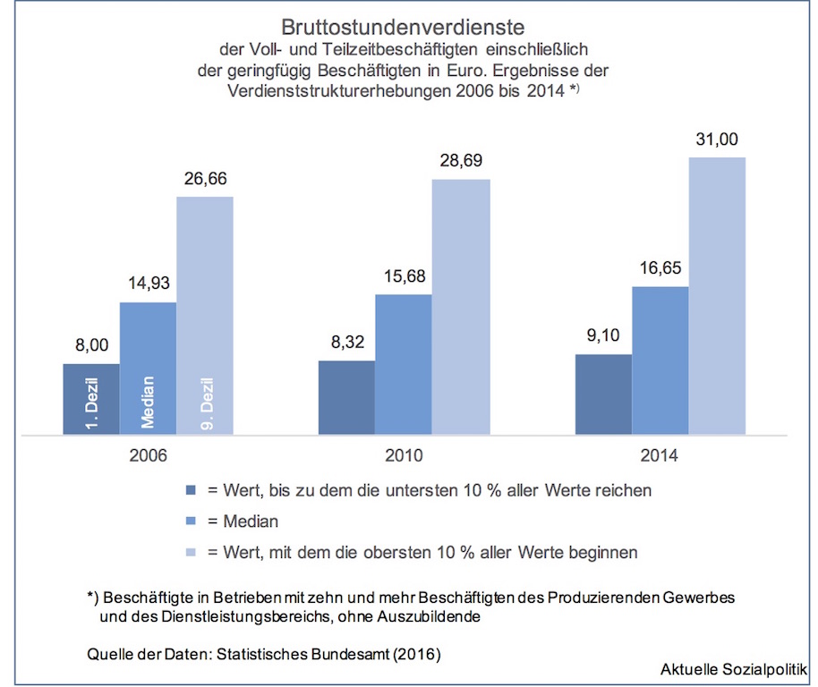 Endlich mal wieder gute Nachrichten, wird der eine oder andere gedacht haben, als das Statistische Bundesamt mit dieser Meldung an die Öffentlichkeit gegangen ist: Trend gestoppt: Lohnspreizung nicht weiter gewachsen. Was ist passiert? Dazu die Bundesstatistiker: »Der Verdienstabstand zwischen Gering- und Besserverdienern ist zwischen 2010 und 2014 nahezu konstant geblieben. Wie das Statistische Bundesamt (Destatis) mitteilt, ist damit der langjährige Trend einer zunehmenden Lohnspreizung gestoppt. Das sogenannte Dezilsverhältnis lag 2014 mit 3,41 leicht unter dem Niveau von 2010 (3,45). 2006 hatte es noch 3,33 betragen.« Das hört sich nicht wirklich simpel an. Also lesen wir weiter: »Das Dezilsverhältnis ist ein Maß zur Messung des Abstands zwischen Geringverdienern (untere 10 % der Lohnskala) und Besserverdienern (obere 10 %). Hierfür wird der Bruttostundenverdienst, ab dem man als Besserverdiener zählt (2014: 31,00 Euro), ins Verhältnis gesetzt zum Bruttostundenverdienst, bis zu dem Geringverdiener reichen (9,10 Euro). Dabei werden sowohl Vollzeit- als auch Teilzeitbeschäftigte einschließlich der geringfügig Beschäftigten betrachtet.«