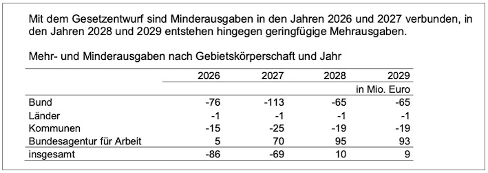 Mittlerweile wurde ein 92 Seiten umfassender erster Aufschlag für die anstehende gesetzgeberische Umsetzung aus dem Bundesministerium für Arbeit und Soziales (BMAS) vorgelegt: der Referentenentwurf eines Dreizehnten Gesetzes zur Änderung des Zweiten Buches Sozialgesetzbuch und anderer Gesetze. Bearbeitungsstand: 16.10.2025. Und schaut man nach in diesen Entwurf – der sich jetzt in die regierungsinterne Abstimmung befindet -, dann findet man auf der Seite 6 die folgende trockene Aufstellung die finanziellen Auswirkungen des Gesetzentwurfs betreffend: