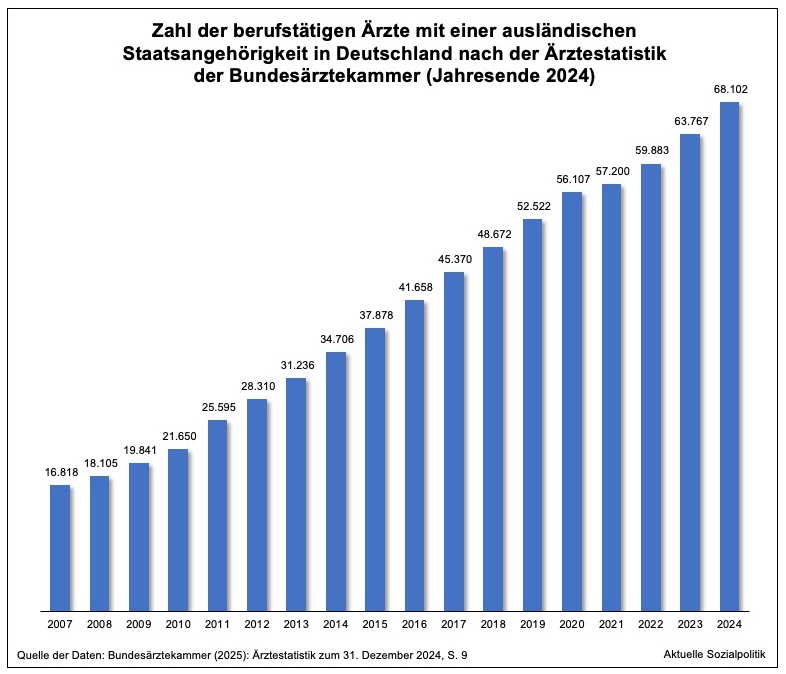 Die vom Statistischen Bundesamt präsentierten Zahlen basieren auf dem Mikrozensus, als eine Befragung von einem Prozent der Bevölkerung. Und die aus dieser Stichprobe hochgerechneten Werte stimmen gut überein mit einer Vollerhebung, wie sie jährlich von der Bundesärztekammer, bei der alle (berufstätigen und ohne ärztliche Tätigkeit) Ärzte gemeldet sein müssen, veröffentlicht wird. Schaut man in die Ärztestatistik zum 31. Dezember 2024, dann werden dort insgesamt 68.102 Ärzte mit ausländischer Staatsangehörigkeit ausgewiesen (das sind etwas mehr als die 64.000 vom Statistischen Bundesamt genannten Mediziner).
