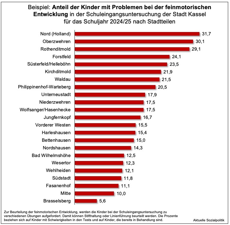 Das Beispiel der erheblichen Streuung der Anteilswerte für Probleme bei der feinmotorischen Entwicklung auf Basis der Schuleingangsuntersuchungen des Gesundheitsamtes Region Kassel für das Schuljahr 2024/25 zwischen den Stadtteilen verdeutlicht das Problem: