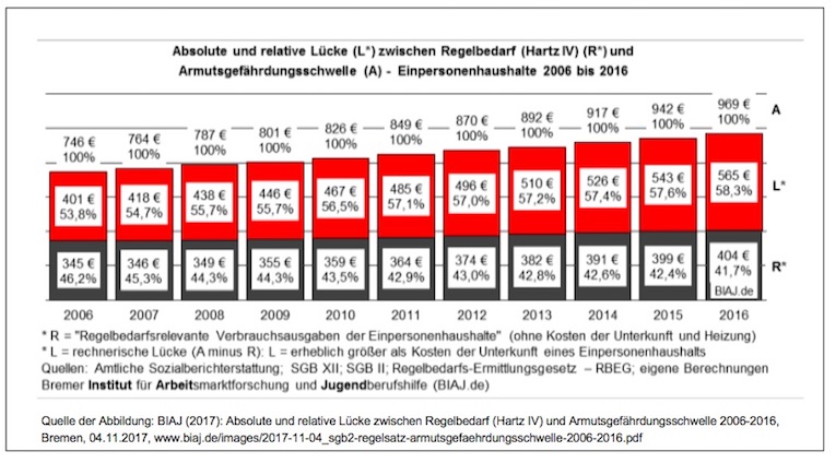 »2006, im ersten Kalenderjahr mit einer im ganzen Kalenderjahr bundeseinheitlichen monatlichen „Regelleistung zur Sicherung des Lebensunterhalts“ (inzwischen „Regelbedarf“) in Höhe von 345 Euro (Hartz IV), lag dieser „Regelbedarf“ (ohne Kosten der Unterkunft und Heizung) rechnerisch um 401 Euro (absolut) bzw. 53,8 Prozent (relativ) unter der amtlichen Armutsgefährdungsschwelle für Einpersonenhaushalte in Höhe von 746 Euro.