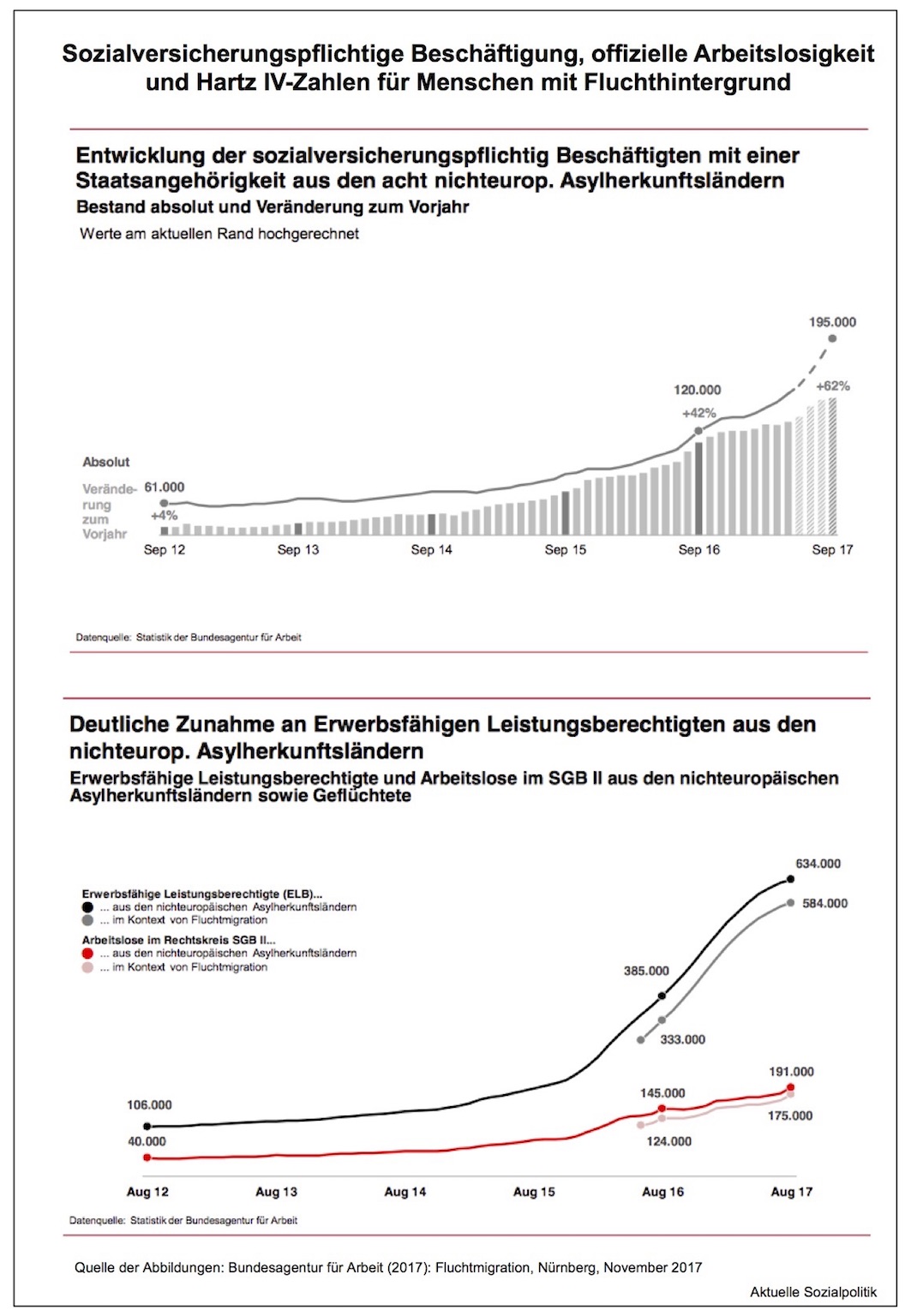 Wenn man als unbedarfter Beobachter die deutsche Medienlandschaft verfolgt, dann könnte man den Eindruck bekommen, im Jahr 2017 ist zumindest das Thema neue Flüchtlinge, die nach Deutschland kommen, erledigt. Dem ist nicht so, wie man den trockenen Zahlen entnehmen kann. Die monatlich herausgegebene Asylantragsstatistik des Bundesamtes für Migration und Flüchtlinge (BAMF) verdeutlicht die Entwicklung seit dem Januar 2016. Nun kann man an dieser Stelle einwenden, dass das insofern verzerrt ist, weil hier die Monatswerte für die gestellten und als solche auch registrierten Asylanträge ausgewiesen werden. Dennoch kann man von dem folgenden Befund ausgehen: Monat für Monat kommen im Schnitt mindestens 15.000 Menschen neu zu uns. Man rechne diese – deutlich geringere Zahl als noch im Jahr 2016, geschweige denn 2015 – auf zwölf Monate hoch, dann wissen wir, dass auch in diesem Jahr (mindestens) 180.000 Menschen hier Asyl suchen werden. Das IAB schreibt dazu im Zuwanderungsmonitor November 2017: