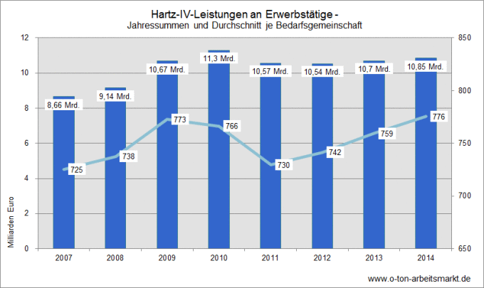 Es ist aber davon auszugehen, dass die Subventionierung der Niedrigeinkommen weiter auf einem hohen Niveau liegen wird. Die vielen Minijobber werden auch weiterhin einen Anspruch auf aufstockende Leistungen haben und auch viele derjenigen, die in einem Teil- oder gar Vollzeitjob arbeiten, werden weiter Leistungen bekommen, vor allem, wenn sie in Bedarfsgemeinschaften leben, also mit zwei oder mehr Personen, die hilfebedürftig sind. Zurückgehen müssten allerdings die Zahlbeträge, wenn der Mindestlohn wirkt. Aber wie gesagt – ohne die entsprechenden Daten seitens der BA kann man hier nur spekulieren. Vielleicht stellt ja mal einer der Parlamentarier aus der Opposition im Bundestag eine kleine Anfrage zu diesem Thema und man kann so die Zeit etwas verkürzen.