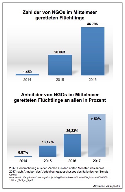 »Nichtregierungsorganisationen (NGO) wird vorgeworfen, ihre Präsenz auf dem Mittelmeer zur Rettung von Migranten sorge dafür, dass sich immer mehr Flüchtlinge auf den Weg nach Europa machten. Fachleute nennen diesen Ansatz die „Pull-Factor-Theorie“. Der Vorwurf ist nicht neu und war ursprünglich nicht nur gegen die NGO gerichtet. Von der Europäischen Grenzschutzagentur Frontex wurde er bereits in Bezug auf die italienische Rettungsmission Mare Nostrum erhoben. Gil Arias, der damalige stellvertretende Frontex-Chef, sagte am 4. September 2014 im Justizausschuss des Europaparlaments, dass „die Schleuser mehr Menschen auf See schicken, in der Annahme, sie würden schon bald gerettet. Das sei billiger für sie, denn sie bräuchten weniger Treibstoff, weniger Essen, weniger Wasser, was gleichzeitig aber auch die Risiken für die Migranten erhöht“. Dieser Vorwurf wird nun den NGO auf dem Mittelmeer gemacht.«