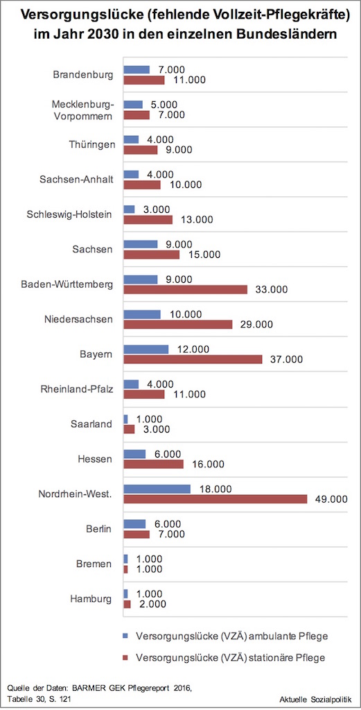 Die Bundesagentur für Arbeit (BA) kommt in ihrem im Juli 2016 veröffentlichten Bericht Der Arbeitsmarkt in Deutschland – Fachkräfteengpassanalyse zu dem Befund, dass es in den Gesundheits- und Pflegeberufen einen Mangel gibt bei examinierten Gesundheits- und Krankenpflegefachkräften und bei examinierten Altenpflegefachkräften. »Bei Gesundheits- und Krankenpfleger/innen beträgt die Vakanzzeit von Stellenangeboten 128 Tage (+42 Prozent über dem Durchschnitt aller Berufe). Gemeldete Stellenangebote für examinierte Altenpflegefachkräfte sind im Bundesdurchschnitt 153 Tage vakant. Das sind 70 Prozent mehr als die durchschnittliche Vakanzzeit über alle Berufe.« Speziell zur Altenpflege vgl. auch den im September 2016 veröffentlichten BA-Bericht Arbeitsmarkt Altenpflege – Aktuelle Entwicklungen. Das alles hat Folgen bzw. potenziert problematische Entwicklungen, die sich aus anderen Quellen speisen.