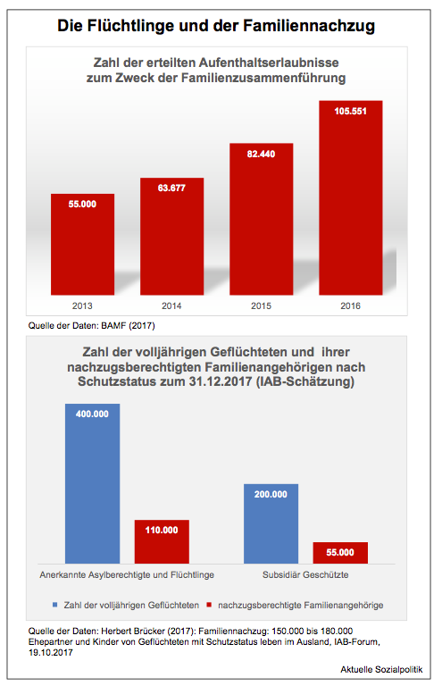 »Bis Ende 2017 werden voraussichtlich rund 600.000 volljährige Geflüchtete mit Schutzstatus in Deutschland leben. Rund 400.000 von ihnen werden als anerkannte Asylbewerber und Flüchtlinge nach der Genfer Flüchtlingskonvention das Recht auf den Nachzug ihrer Ehepartner und minderjährigen Kinder haben. Weitere 200.000 haben überwiegend einen subsidiären Schutzstatus. Für sie wurde der Familiennachzug ausgesetzt, wenn sie seit April 2016 zugezogen sind. Auf die anerkannten Asylbewerber und Geflüchteten werden bis Ende 2017 voraussichtlich 100.000 bis 120.000 Ehepartner und minderjährige Kinder im Ausland entfallen, die einen Anspruch auf Familiennachzug haben. Würden zusätzlich Personen mit subsidiären Schutzstatus berücksichtigt, stiege die Zahl der nachzugsberechtigen Ehepartner und Kinder um 50.000 bis 60.000. Die vergleichsweise geringen Zahlen für den Familiennachzug erklären sich daraus, dass viele Geflüchtete ledig sind und sich deren Kinder und Ehepartner bereits mehrheitlich in Deutschland befinden.«