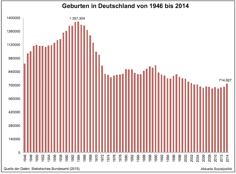 Offensichtlich werden wieder mehr Kinder auf die Welt gebracht, wie die Abbildung mit der Geburtenentwicklung in Deutschland in den Jahren 1946 bis 2014 verdeutlichen kann. Dazu Karl Doemens in seinem Artikel: »Nach zwei Jahrzehnten mit niedrigen Geburtenraten kündigt sich in Deutschland eine Trendwende an: Zum dritten Mal in Folge haben Frauen in Deutschland im vergangenen Jahr mehr Kinder zur Welt gebracht als im Vorjahr.«