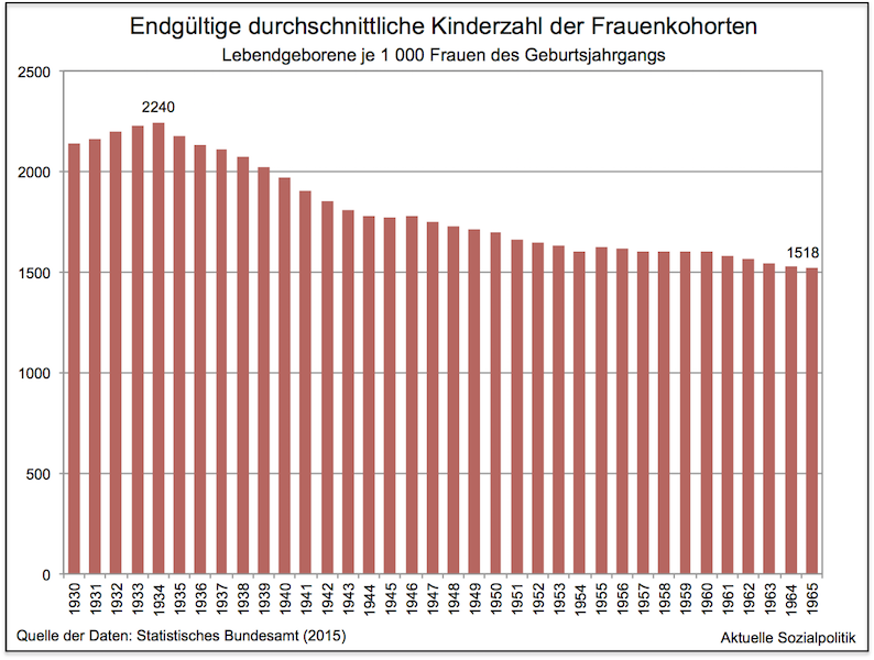 »Im Jahr 2014 erreichten die Frauen des Jahrgangs 1965 das Alter von 49 Jahren. Sie brachten im Laufe ihres Lebens durchschnittlich 1,55 Kinder zur Welt. Seit der deutschen Vereinigung sank diese sogenannte endgültige Kinderzahl je Frau um 19 %: Die Frauen des Jahrgangs 1941, die im Jahr 1990 das Alter von 49 Jahren erreicht hatten, brachten noch 1,92 Kinder zur Welt.«