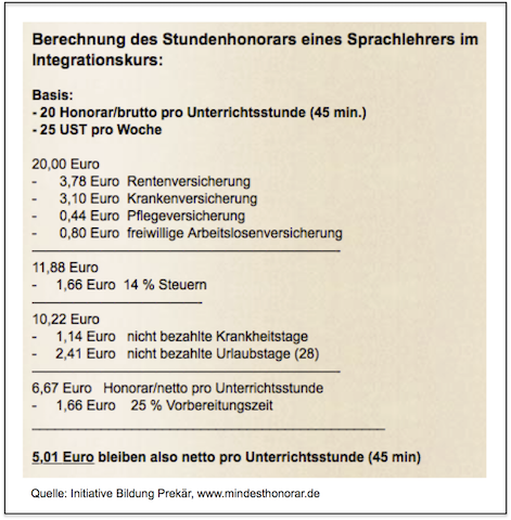 An der Bezahlung hat sich seit der letzten Anhebung nichts geändert: 35 Euro pro Unterrichtsstunde erhält eine Honorarkraft für den Integrationskurs. Die Anhebung von durchschnittlich 23 auf 35 Euro sei zwar ein richtiger Schritt gewesen, reiche aber bei weitem nicht aus, so die GEW: Umgerechnet in eine sozialversicherungspflichtige Beschäftigung käme man laut GEW gerademal auf den Mindestlohn in der Weiterbildungsbranche, der auch für Nicht-Akademiker gilt.
