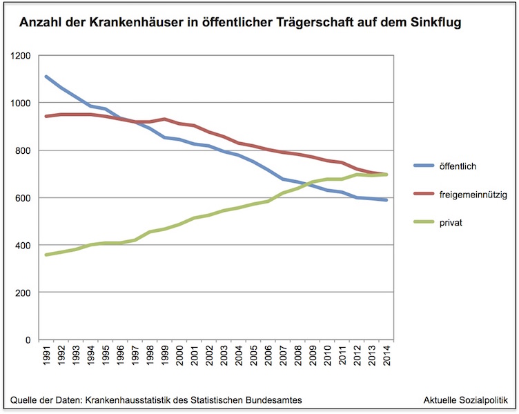 Seit Beginn der 1990er Jahren sind wir Zeugen eines stetigen Niedergangs der öffentlichen, also kommunalen Trägerschaft von Krankenhäusern – deren Zahl hat erheblich abgenommen, spiegelbildlich müssen wir eine massive Ausbreitung privater, auf Gewinn ausgerichteter Krankenhausträger zur Kenntnis nehmen (vgl. dazu auch den Blog-Beitrag Wenn aus einem bislang städtischen Krankenhaus ein kirchliches wird und eine der ersten Amtshandlungen aus der Abschaltung von Betriebsrat und Tarifbindung besteht. Wieder einmal die Kirchen und ihr Sonderrecht vom 17. Märt 2016). An der Börse notierten Krankenhausbetreibern werden regelmäßig rosige Zukünfte bescheinigt. Dass eine Klinik zuallererst eine existenzielle Aufgabe hat und wenn, dann in einem zweiten oder dritten Schritt die Frage nach den Kosten und deren Finanzierung von Relevanz sein sollte, diese über lange Jahre gepflegte und durchaus begründbare Hierarchie hat sich im Zuge der Ökonomisierung des Gesundheitswesens sukzessive wenn nicht aufgelöst, so dann doch auf alle Fälle an Gewicht verloren.