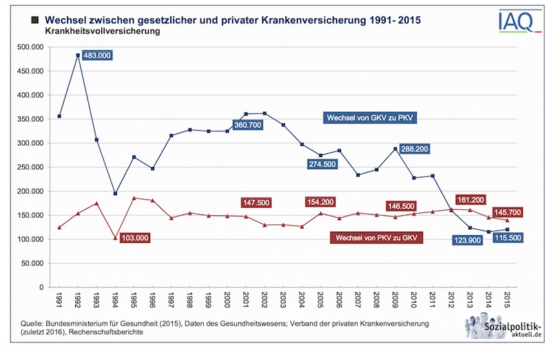 Abbildung 1: Wechsel zwischen gesetzlicher und privater Krankenversicherung 1991- 2017, sozialpolitik-aktuell.de
