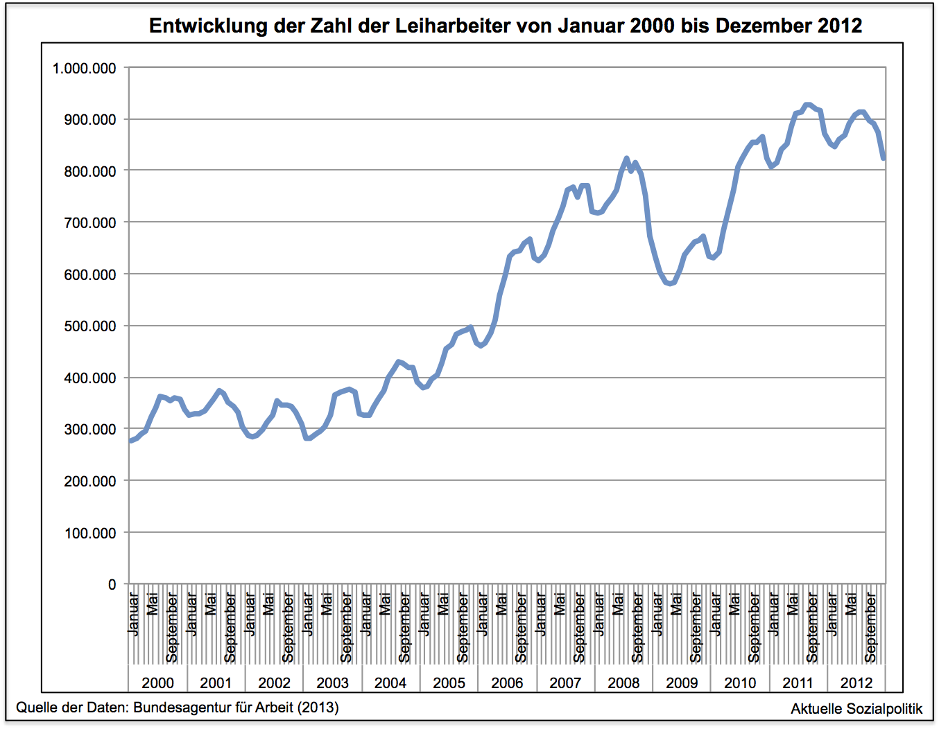 Im Zuge der umfassenden Deregulierung der Leiharbeit durch die damalige rot-grüne Bundesregierung gab es dann eine massive Expansion der Leiharbeit in Deutschland, wie man der Abbbildung mit der Zahl der Leiharbeiter entnehmen kann. Dabei wurde schnell klar, dass ein nicht kleiner Teil der die Leiharbeit nutzenden Unternehmen die Beschäftigung von Leiharbeitern nicht als Überbrückung einmaliger Arbeitsanfälle oder als verlängerte Probezeit vor der Übernahme in Anspruch genommen hat – was den Hoffnungen eines Teils der Befürworter einer Deregulierung der Leiharbeit, über den „Klebeeffekt“ Arbeitslosigkeit abbauen zu können, bestätigt hätte -, sondern die Leiharbeiter wurden als „zweite Belegschaftsschicht“ zur Tarifflucht und zum Lohndumping innerhalb der Betriebe instrumentalisiert.