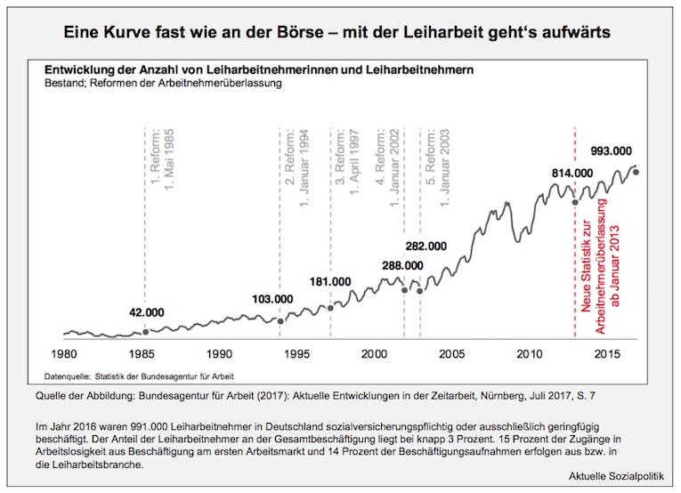Und die skeptischen Einschätzungen der Kritiker der Neuregelungen der Leiharbeit sind offensichtlich nicht aus der Luft gegriffen. Dem Business des Menschenverleihs geht es nicht schlecht, wie solche Zahlen verdeutlichen: Zeitarbeit erreicht Eine-Million-Marke: »In diesen Tagen übersteigt die Belegschaft der etwa 11.000 Zeitarbeitsfirmen die Marke von einer Million Menschen, das sind doppelt so viele wie noch vor zehn Jahren. Eine genauere Analyse wurde hier bereits im Juli 2017 veröffentlicht: Sie wächst und gedeiht, die Leiharbeit. Die Probleme, die aus der Branche gemeldet werden, sind denn auch weniger Probleme mit der vielbeschworenen „Strangulierung“ durch den Gesetzgeber, sondern strukturelle Wachstumsbremsen, die sich aus dem Geschäftsmodell in Verbindung mit der allgemeinen Arbeitsmarktentwicklung ergeben: »Die offensichtlich trotz der angeblich existenzbedrohenden Regulierung seitens der Politik florierende und expandierende Branche hat mittlerweile erhebliche Probleme, genügend Arbeitskräfte für die Aufträge zu rekrutieren. Da überrascht es nicht, dass sie Ausschau hält nach neuen Quellen für die Rekrutierung von Leiharbeitern. Dass man dabei ein Auge auf die Flüchtlinge geworfen hat, überrascht dann auch nicht mehr.«