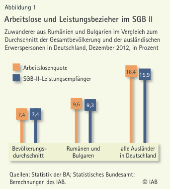 Die Abbildung, die dem IAB-Bericht entnommen ist, verdeutlicht anschaulich, dass die Betroffenheit der Rumänen und Bulgaren sowohl von (gemessener) Arbeitslosigkeit und von Grundsicherungsbezug zwar etwas höher liegt als der Bevölkerungsdurchschnitt, aber deutlich unter der aller Ausländer in Deutschland.