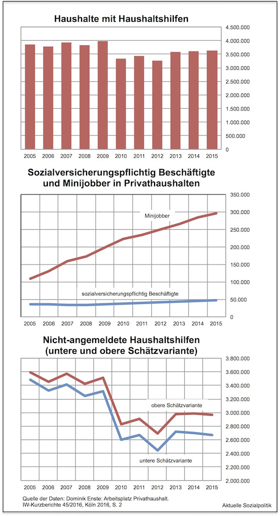 Dabei ist die Zahl der Privathaushalte, die eine Haushaltshilfe beschäftigen, in den vergangenen Jahren – Enste betrachtet die zehn Jahre von 2005 bis 2015 – relativ konstant geblieben. 2005 waren das 3,86 Millionen, für 2015 werden 3,62 Millionen Haushalte ausgewiesen. Zwischen 8 und 10 Prozent aller Haushalte haben in den zurückliegenden Jahren demnach eine Haushaltshilfe beschäftigt.