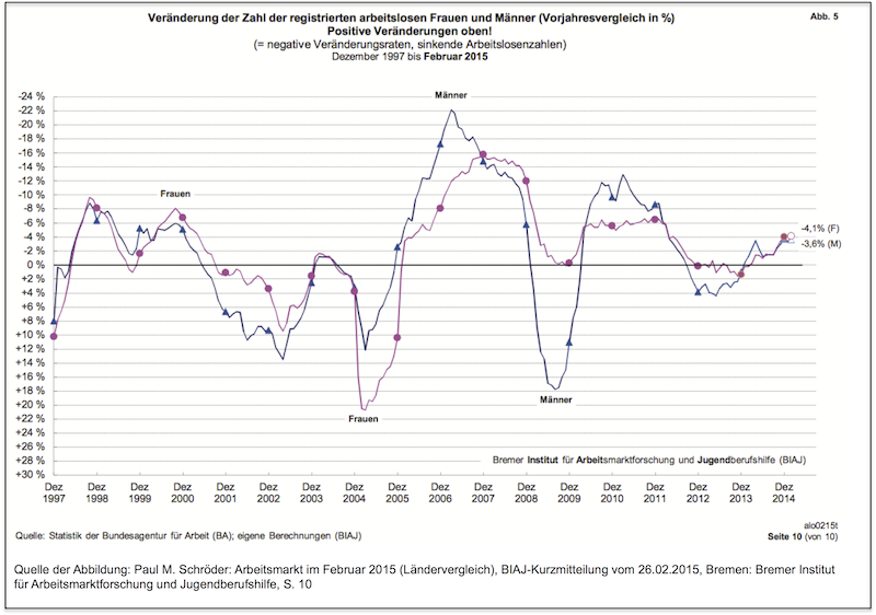 Jetzt kommt mal wieder etwas Bewegung in dieses „vergessene“ Thema. Dies zum einen vor dem Hintergrund der Mindestlohn-Debatte, denn wenn auch die im Vorfeld der Einführung des gesetzlichen Mindestlohns von vielen Ökonomen in den Raum gestellten schweren Verwerfungen auf dem Arbeitsmarkt ausgeblieben sind, konnte man am Anfang des Jahres Rückgänge bei der Zahl der geringfügig Beschäftigten beobachten, die über das übliche Muster hinausgehen. Dies wird sofort aufgegriffen als Beleg für die „zerstörerischen“ Wirkungen des Mindestlohns. Vgl. hierzu beispielsweise Dominik Groll vom Institut für Weltwirtschaft (IfW) in Kiel in seinem kurzen Beitrag Mindestlohn: erste Anzeichen für Jobverluste, der in der Zeitschrift „Wirtschaftsdienst“ veröffentlicht wurde. Aber auch er muss zugeben, dass wir uns derzeit hier im Bereich der Spekulation bewegen, es fehlen nicht nur Daten, sondern auch eine Gesamtbilanzierung ist derzeit nicht möglich (so bereits in meiner im April verfassten Kurzexpertise diskutiert: Stefan Sell: 100 Tage gesetzlicher Mindestlohn in Rheinland-Pfalz. Eine erste Bestandsaufnahme und offene Fragen einer Beurteilung der Auswirkungen auf den Arbeitsmarkt. Remagener Beiträge zur Sozialpolitik 16-2015. Remagen 2015).