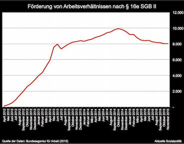 Was diese Aufzählung der im § 16e SGB II normieren Voraussetzungen bereits deutlich macht: Offensichtlich wollte der Gesetzgeber die Fördermöglichkeit über dieses Instrument auf eine möglichst kleine Gruppe an besonders beeinträchtigten Langzeitarbeitslosen begrenzen. Das ist ihm in mehrfacher Hinsicht auch gelungen. Angesichts der Tatsache, dass wir im Hartz IV-System von weit mehr als einer Million Menschen sprechen, die als langzeitarbeitslos gezählt werden müssen, darunter viele mit mehreren „Vermittlungshemmnissen“, erscheinen knapp 8.000 Förderfälle im November 2015 in ganz Deutschland nun wirklich mehr als übersichtlich, um das nett auszudrücken.