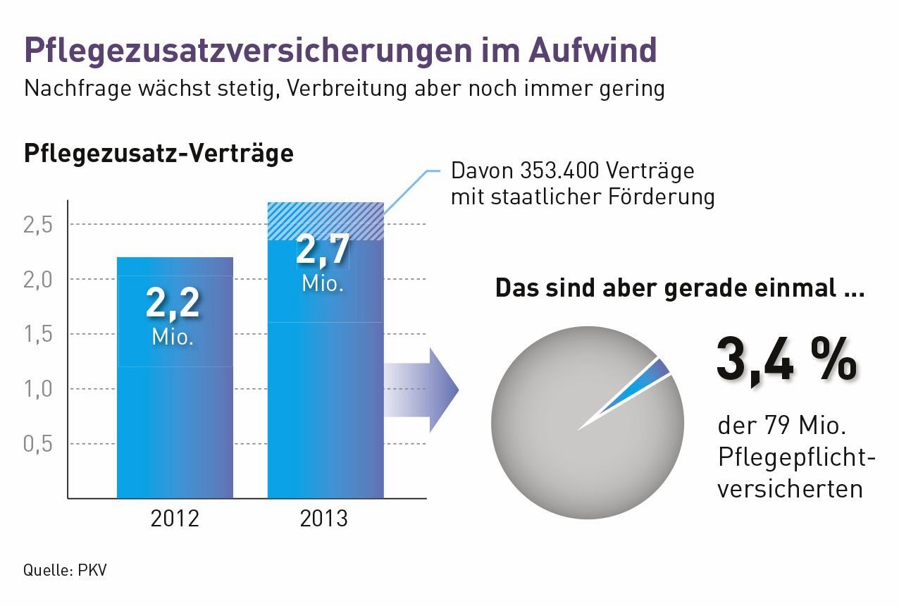 Der Verband der Privaten Krankenversicherung (PKV) hat aktuell die Präsentation der Geschäftszahlen 2013 unter die Überschrift „Rasantes Wachstum in privater Pflegevorsorge“ gestellt: «So wurden im Jahr 2013 allein 353.400 geförderte Pflegezusatzversicherungen abgeschlossen. Dazu kommen noch 174.100 ungeförderte Policen, sodass der Gesamtbestand an Pflegezusatzversicherungen um mehr als eine halbe Million auf insgesamt über 2,7 Millionen Versicherungen anstieg«, so die Jubelmeldung des Verbandes – schaut man sich allerdings die Relationen genauer an, dann offenbart sich, dass gerade einmal nur 3,4% der Pflegepflichtversicherten eine Pflegezusatzversicherung abgeschlossen haben, wie die vom PKV-Verband selbst veröffentlichte Abbildung zeigt.
